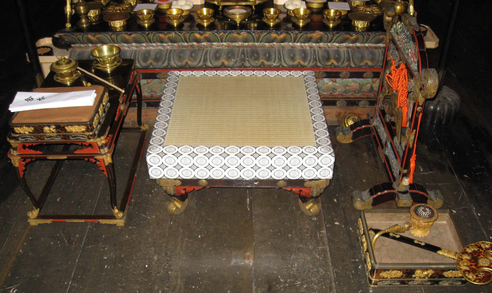 舎利会での使用例。導師が着座する礼盤の左に据箱、右に香炉箱が置かれる。